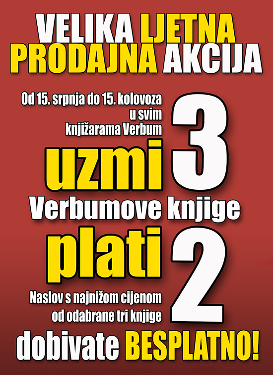 Od 15. srpnja do 15. kolovoza u Verbumovim knjižarama održava se akcija "Uzmi 3 – plati 2" u sklopu koje možete birati iz ponude od preko 450 naslova objavljenih u nakladi Verbuma, a od tri odabrane knjige jedna će biti besplatna, ona s najnižom cijenom.
